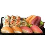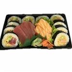 16 stuks-(2 nigiri zalm,2 nigiri tonijn 2 sashimi zalm, 2 sashimi tonijn,4 in/out zalm,4 in/out tonijn)